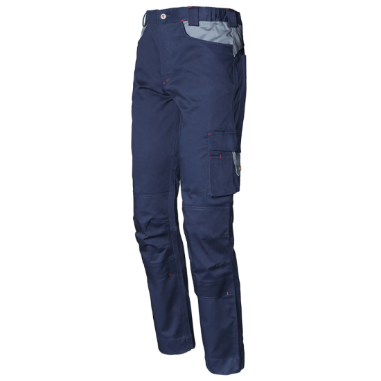 Pantalone in 65% poliestere, 33% cotone e 2% elastan con ginocchia rinforzate in tessuto antiabrasione (92% poliestere, 8% elastan). Dotato di tasche multiple (anteriore con zip e nastratura rifrangente, laterale, posteriori) e doppie tasche porta attrezzi, gancio portamartello e portabadge. Cuciture triple per maggiore resistenza. Ideale per edilizia, manutenzione e trasporti.