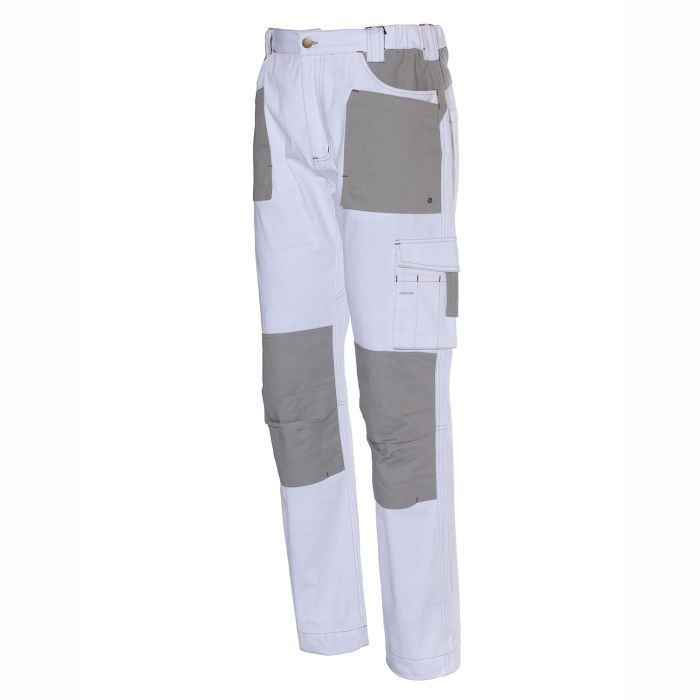 Pantalone in cotone e spandex con elastico in vita per comfort e libertà di movimento. Dotato di tasche multiple, inclusa tasca porta metro, e ginocchiere con rinforzi impermeabili per protezione e durabilità. Ideale per muratori, elettricisti, idraulici e lavori che richiedono resistenza e praticità.